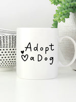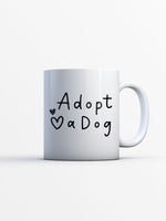 Adopt A Dog printed on the front of this White Ceramic Coffee Mug.