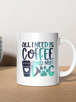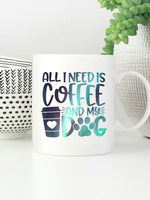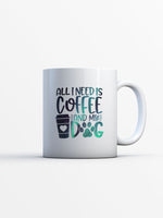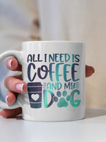 All I Need Is Coffee And My Dog with Green Galaxy font printed on the front of this White Ceramic Coffee Mug.