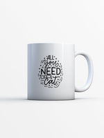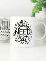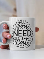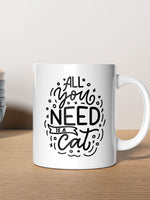 All You Need Is a Cat printed on the front of this White Ceramic Coffee Mug.