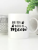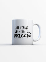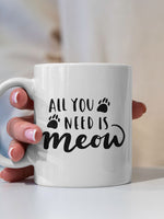 All You Need Is Meow printed on the front of this White Ceramic Coffee Mug.