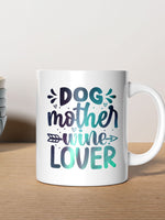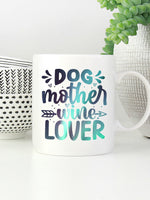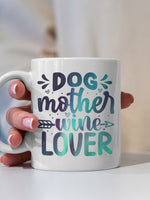 Dog Mother Wine Lover with Green Galaxy font printed on the front of this White Ceramic Coffee Mug.