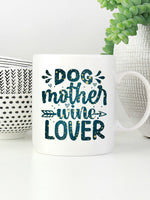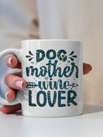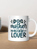 Dog Mother Wine Lover with star font printed on the front of this White Ceramic Coffee Mug.