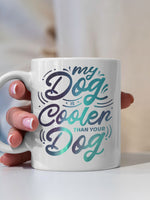 My Dog Is Cooler Than Your DOg with Green Galaxy font printed on the front of this White Ceramic Coffee Mug.