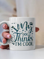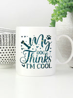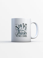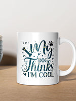 My Dog Thinks I_m Cool with star font printed on the front of this White Ceramic Coffee Mug.