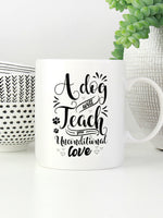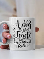 A Dog Will Teach You Unconditional Love printed on the front of this White Ceramic Coffee Mug.