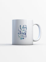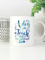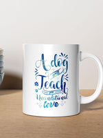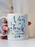 A Dog Will Teach You Unconditional Love with Blue Paint font printed on the front of this White Ceramic Coffee Mug.