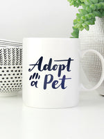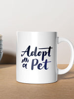 Adopt A Pet With Hearts with Green Galaxy font printed on the front of this White Ceramic Coffee Mug.