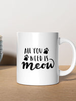 All You Need Is Meow printed on the front of this White Ceramic Coffee Mug.
