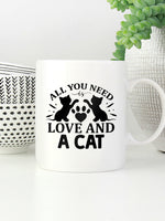 All You Need Love And A Cat printed on the front of this White Ceramic Coffee Mug.